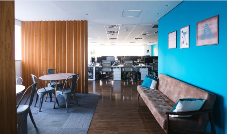 É recomendado ter sempre algum detalhe que representa a empresa, como estruturas de madeira, plantas ou cores da marca (como exemplo a cor da parede da empresa).